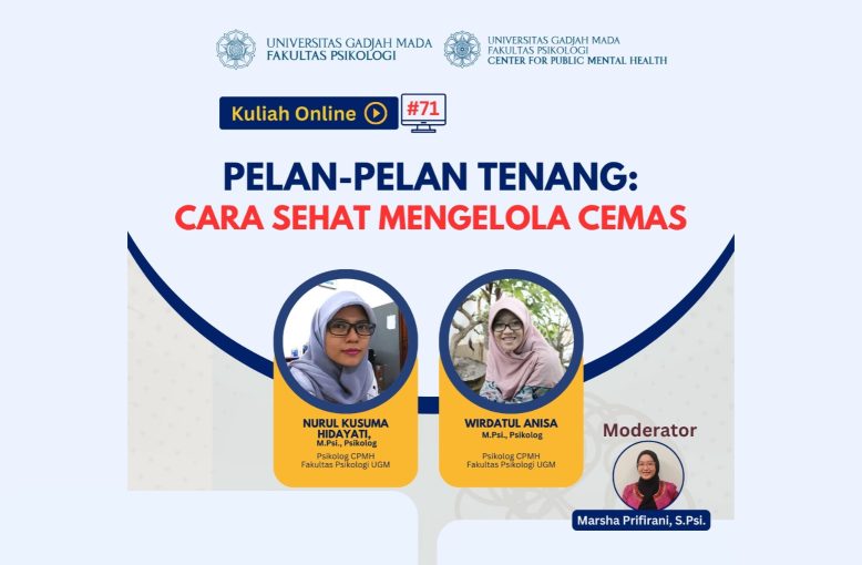 Center for Public Mental Health (CPMH) Fakultas Psikologi UGM kembali menggelar agenda rutinnya, Kuliah Online (Kulon), yang kini memasuki edisi ke-71. Mengusung tema “Pelan-Pelan Tenang: Cara Sehat Mengelola Cemas”, kegiatan ini dilaksanakan secara daring melalui Zoom pada Jumat pagi (24/4), pukul 09.00–10.30 WIB dan dimoderatori oleh Marsha Prifirani, S.Psi.