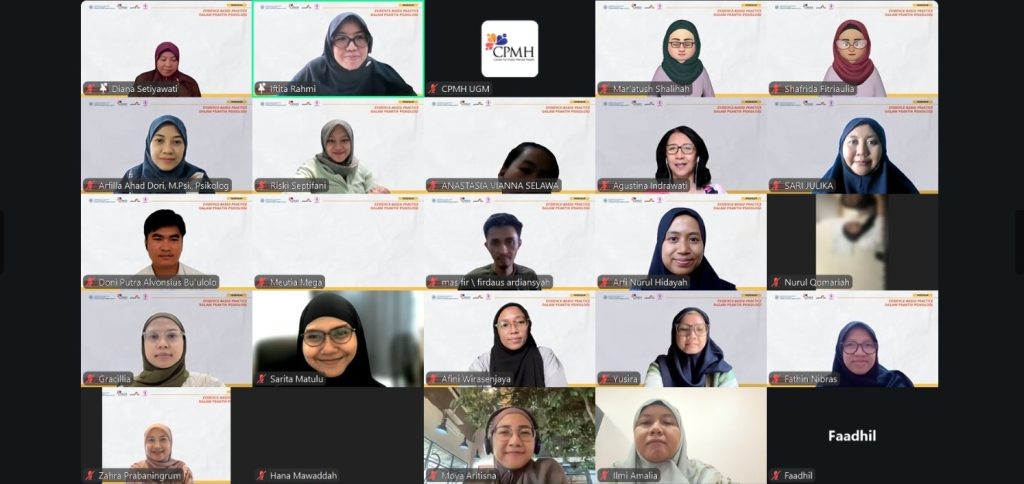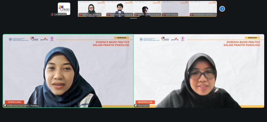 Center for Public Mental Health (CPMH) Fakultas Psikologi UGM berkolaborasi dengan Parentific sukses menyelenggarakan webinar bertajuk “Evidence-Based Practice dalam Praktik Psikologi” pada Senin, 13 April 2026, pukul 08.00–15.30 WIB. Kegiatan ini dilaksanakan secara daring melalui Zoom Meeting dan terakreditasi SKP HIMPSI, dengan sasaran utama para psikolog dan ilmuwan psikologi. Webinar ini diikuti oleh 65 peserta yang berpartisipasi aktif sepanjang kegiatan.