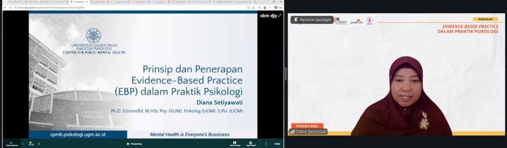 Sesi kedua dilanjutkan oleh Diana Setiyawati, S.Psi., MHSc., Ph.D., Psikolog dari CPMH Fakultas Psikologi UGM, dengan topik “Prinsip dan Penerapan Evidence-Based Practice (EBP) dalam Praktik Psikologi”. Dalam sesi ini, peserta diajak memahami bahwa EBP tidak berhenti pada pencarian intervensi berbasis bukti dari hasil systematic literature review.